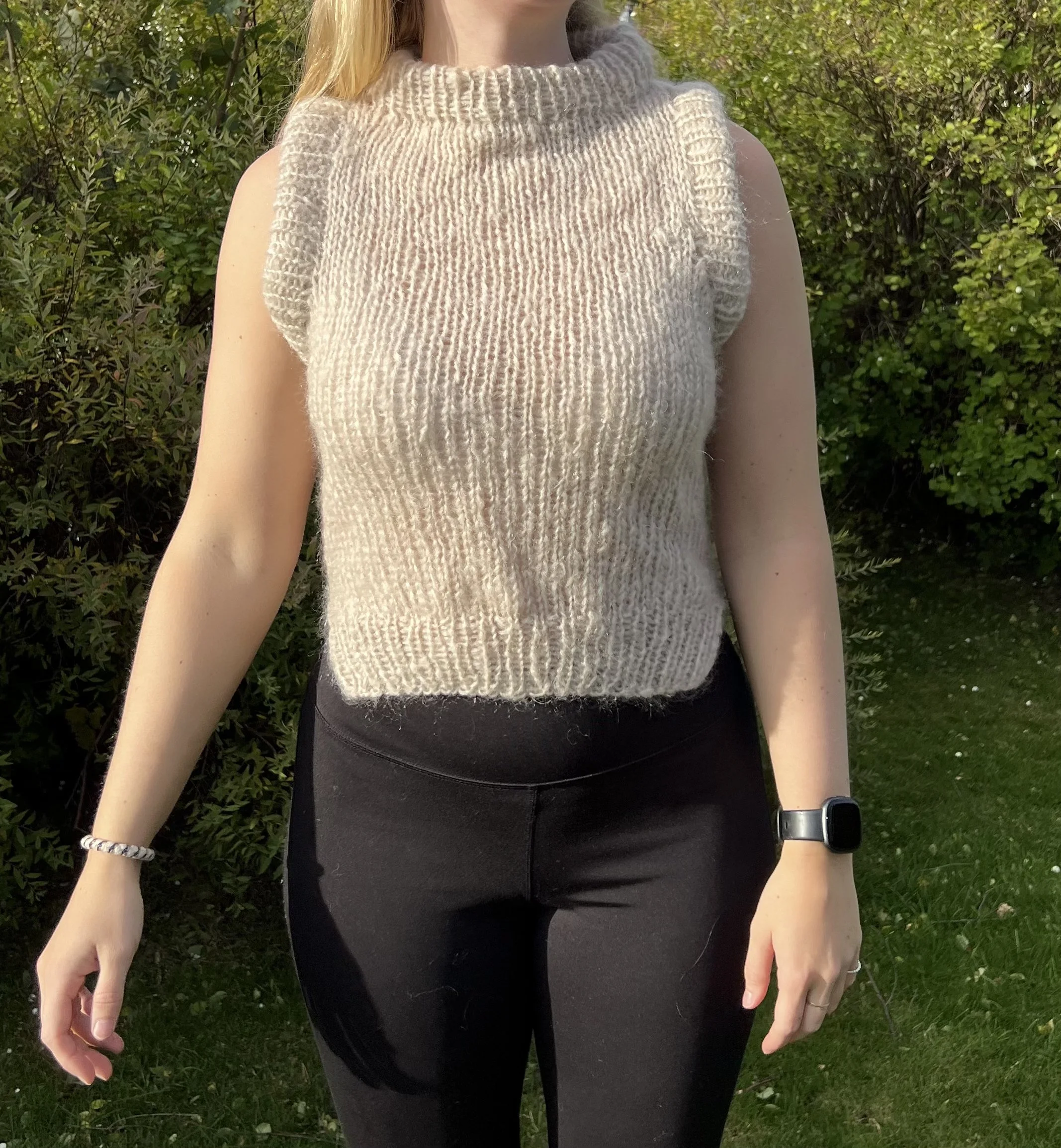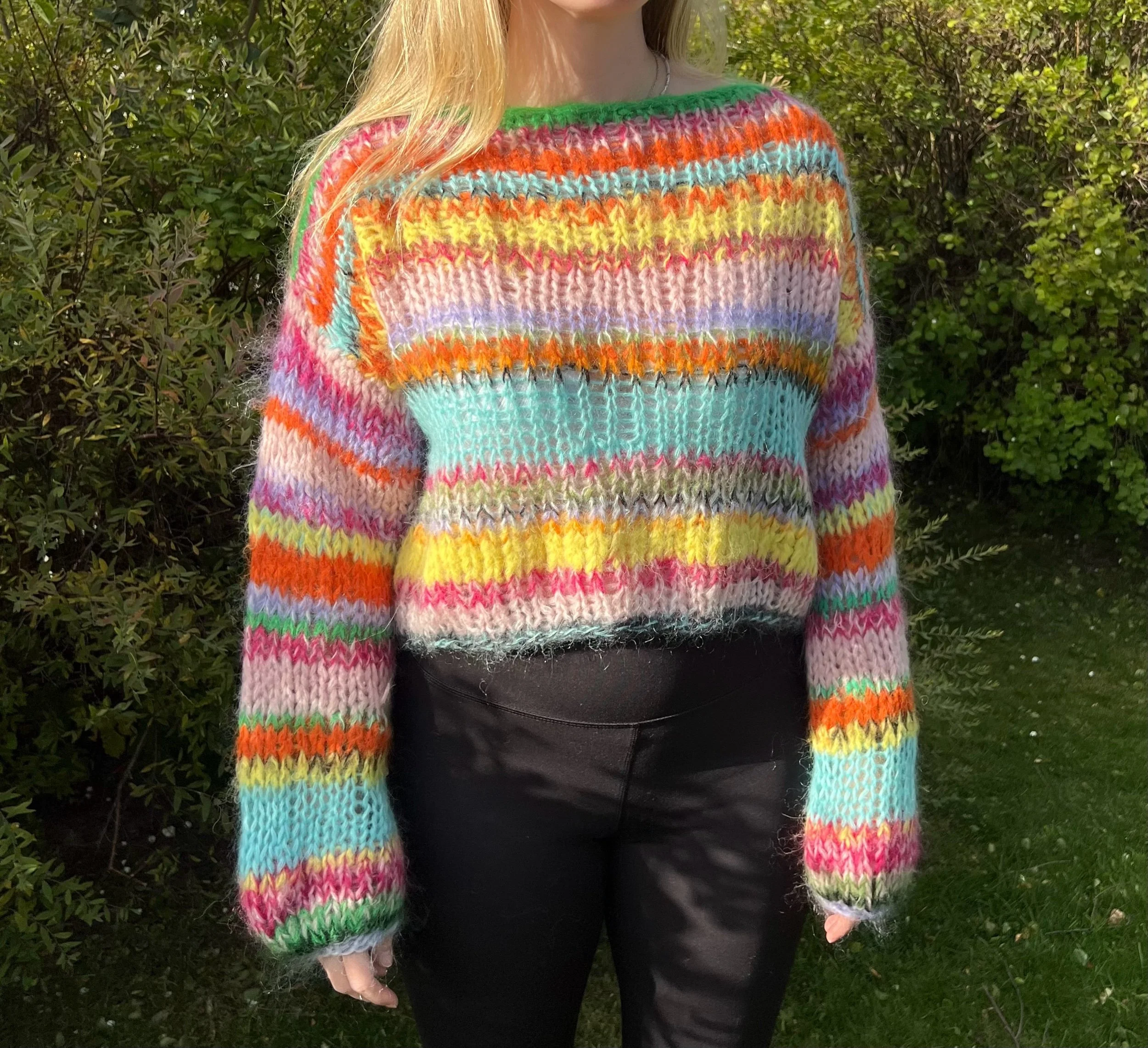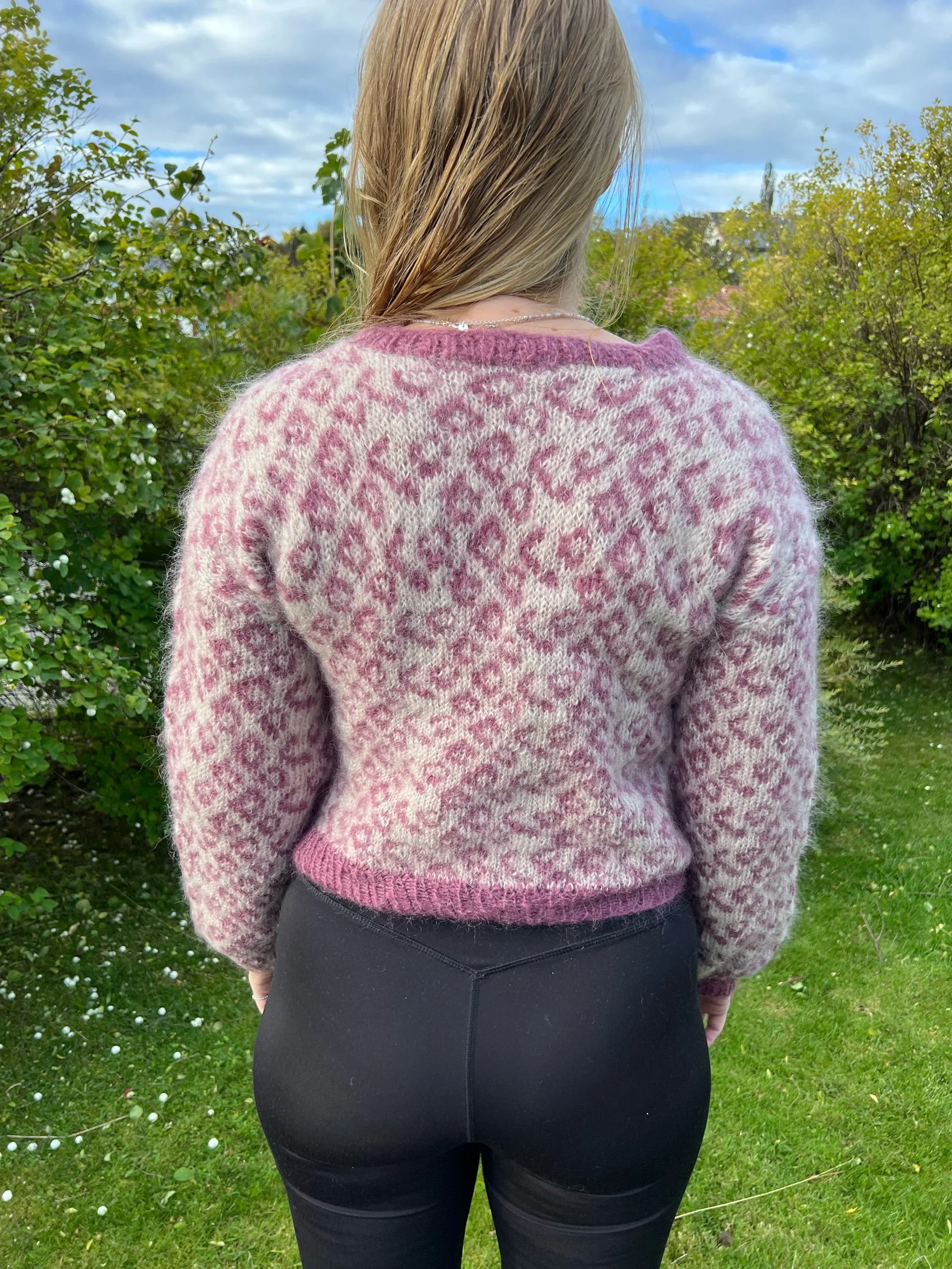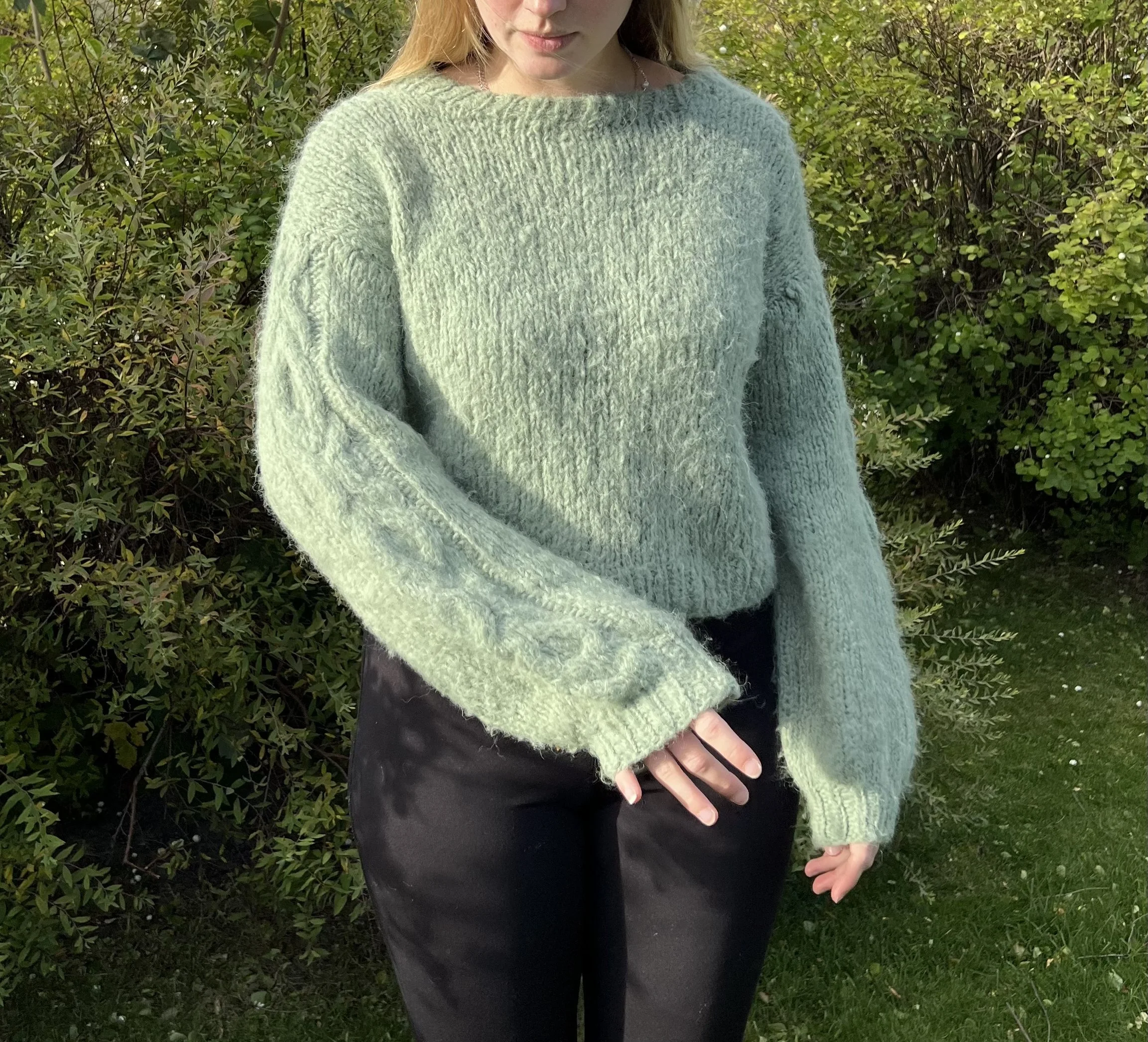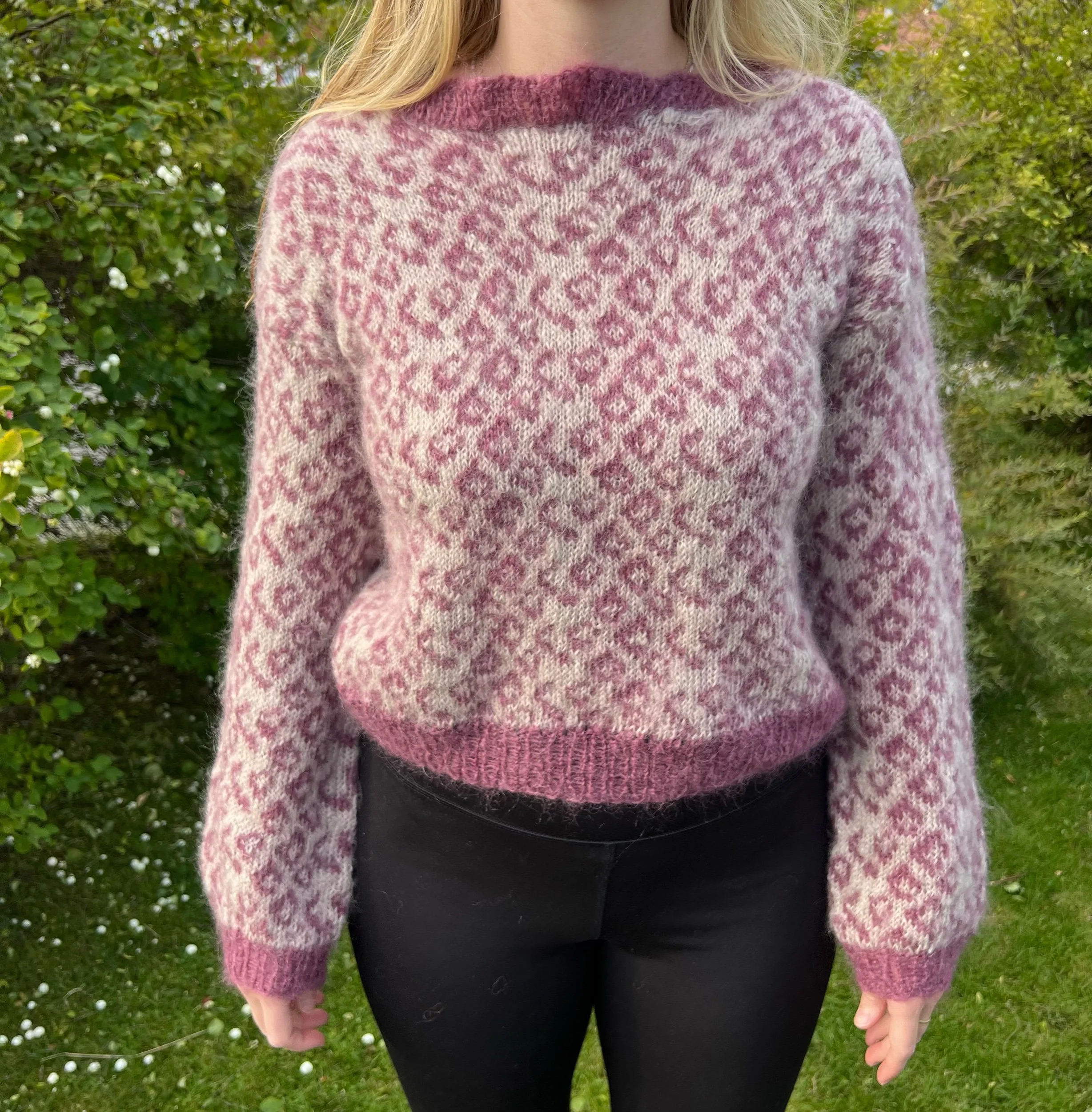 En nydelig raglangenser strikket i en eksklusiv garnkombinasjon av Pretty Print Ullgarn (100 % ull) og Faerytale (100 % alpakka). Sammen gir garnene et mykt, luftig og luksuriøst uttrykk med vakker struktur og elegant fall.